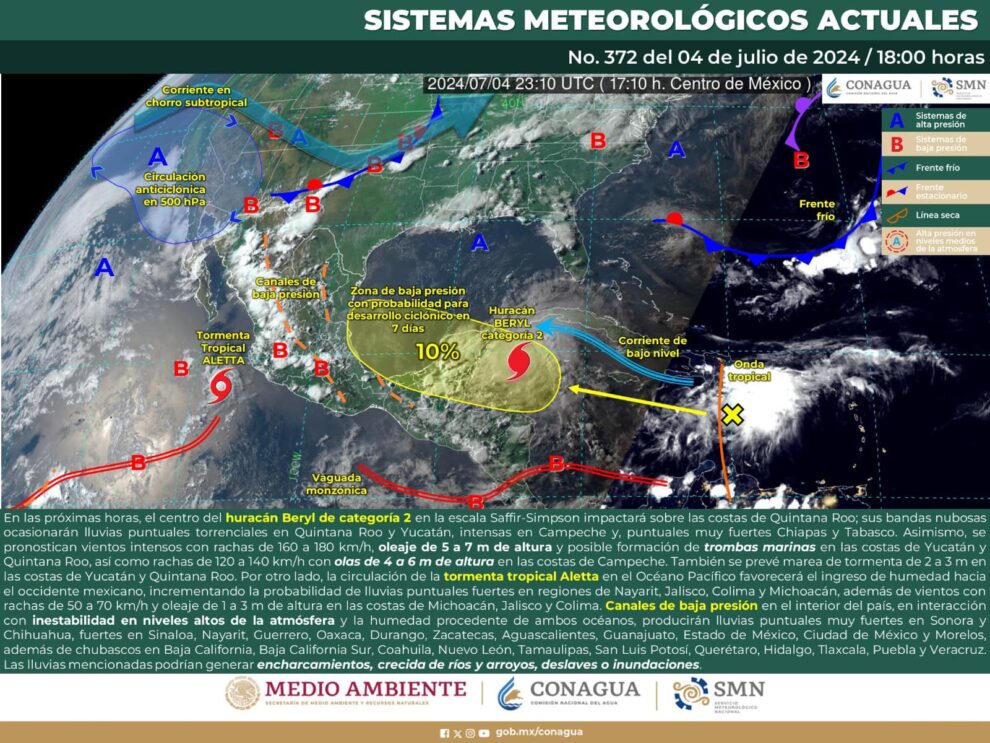 El estado de Quintana que alberga los destinos de Cancún, Riviera Maya y Tulum, entre otros, está en Alerta Roja, peligro máximo en los municipios de Felipe Carrillo Puerto, Tulum, José María Morelos, Cozumel y Solidaridad, ya que el huracán Beryl, todavía categoría 4, mantiene dirección franca a esta zona.