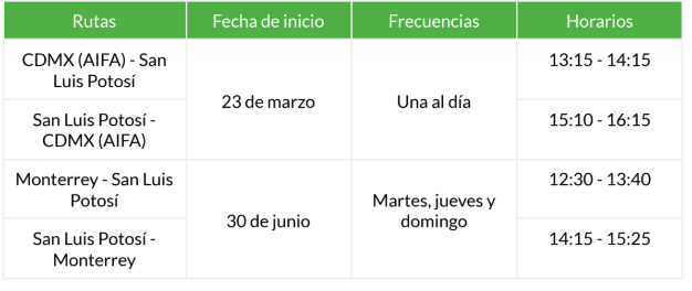 La ruta al AIFA comenzará a operar este próximo 23 de marzo y contará con una frecuencia al día, facilitando ampliamente la conectividad entre San Luis Potosí y el Valle de México. Desde el AIFA, los potosinos podrán conectar con las más de 35 rutas nacionales e internacionales que Viva ofrece desde este nuevo aeropuerto capitalino. Entre estos se encuentran populares destinos turísticos e importantes ciudades como Bogotá, Cancún, Puerto Vallarta, Acapulco, Los Cabos y Guadalajara.